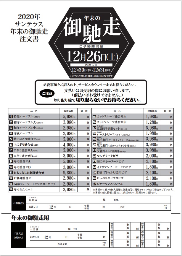 ご注文はリンク先の注文書を印刷の上(A4サイズ) 必要事項をご記入いただき、サンテラスサービスカウンターまでお持ちください。
